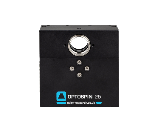 The Cairn Optospin25 continues a long tradition in filter wheel design, dating back to the 1980s, but taking full advantage of the continuing developments in motor and control technology that have taken place since then. It builds on our tried and tested approach of mounting the motor directly within the hub of the filter wheel, in order to maintain a compact size (no motor bulge!) and to minimise the inertial and other losses associated with geared connections. The previous design of this type used a relatively small wheel with 12.5mm diameter filters in order to further reduce the inertia – and hence the response time – but by using a newer and much more powerful type of motor, we have been able to obtain similar performance with this 25mm filter design.